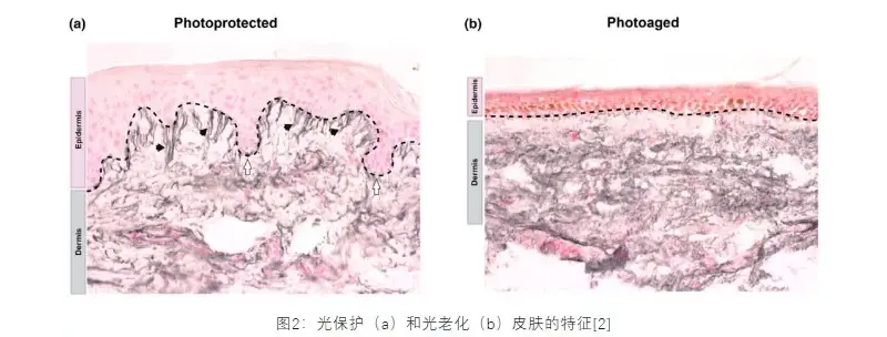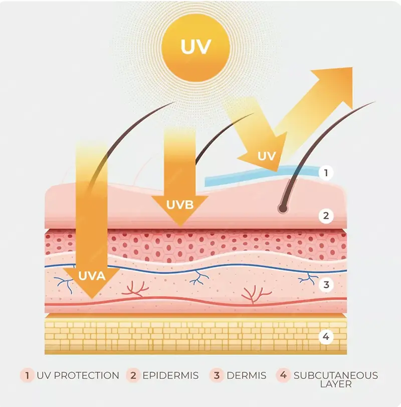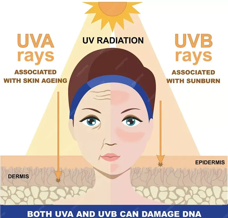 Loro-lorone UVA lan UVB bisa nyebabake kerusakan kulit, nanging efek beda utamane amarga ambane nembus. Pancen Uva bisa nembus luwih jero menyang dermis lan luwih ana hubungane karo fotoget, amarga bakal ngasilake ros lan elastin kolagen lan elastin, sing bakal nyebabake kedutan, kerugian kelenturan kulit lan tanda-tanda-tanda tuwa sing durung wayahe tuwa. Beda, UVB utamane mengaruhi epidermis, nyebabake sunburn (erythema solar) lan produksi melanin ing jangka pendek bisa nyebabake hiper-jangka panjang bisa nyebabake risiko tumors ganas kulit.