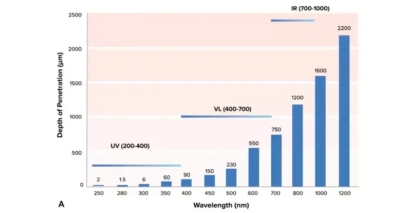 Kaya sing ditampilake ing tokoh ing ndhuwur, katon katon gedhe ing kulit, amarga band iki duwe ambane nembus jero menyang kulit. Lampu abang bisa nembus epidermis lan dermis, lan tekan lapisan lemak, nuduhake hubungan antara ambane lan gegayutan karo gelombang lan energi biru duwe energi sing luwih dhuwur tinimbang cahya abang.
