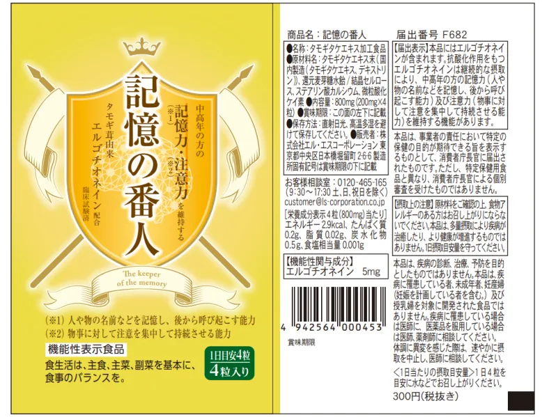 Supplement Ergothioneine diluncurake dening perusahaan LS Jepang yaiku produk sing dirancang kanggo ngatasi penurunan memori ing wong tuwa lan wong tuwa.